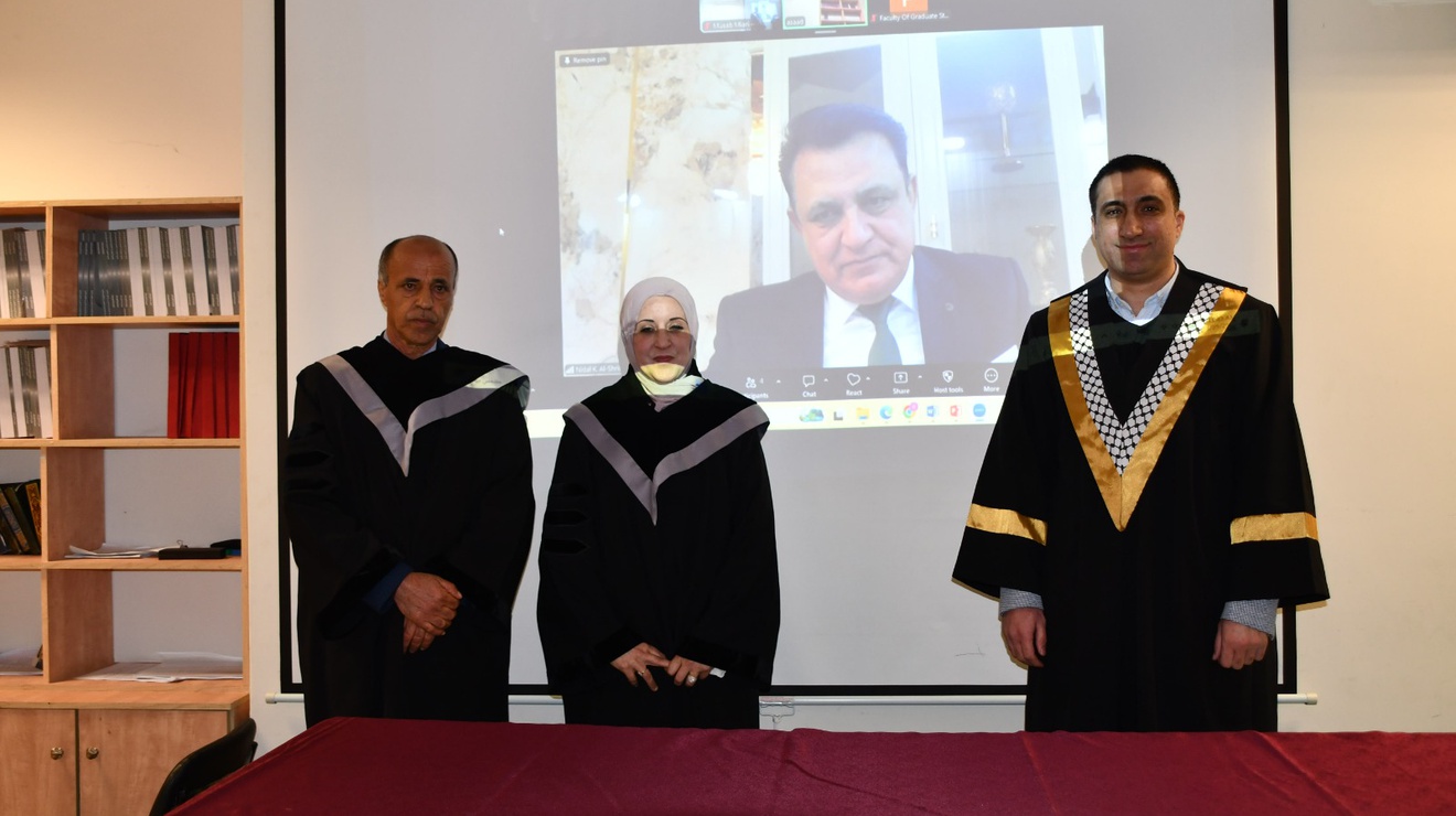 وتكوّنت لجنة المناقشة من الدكتورة اجتياد أبو ثابت مشرفةً رئيسيةً، والأستاذ الدكتور نضال الشريفين من جامعة اليرموك ممتحناً خارجياً، والدكتور زهير خليف من جامعة النجاح الوطنية ممتحناً داخلياً.