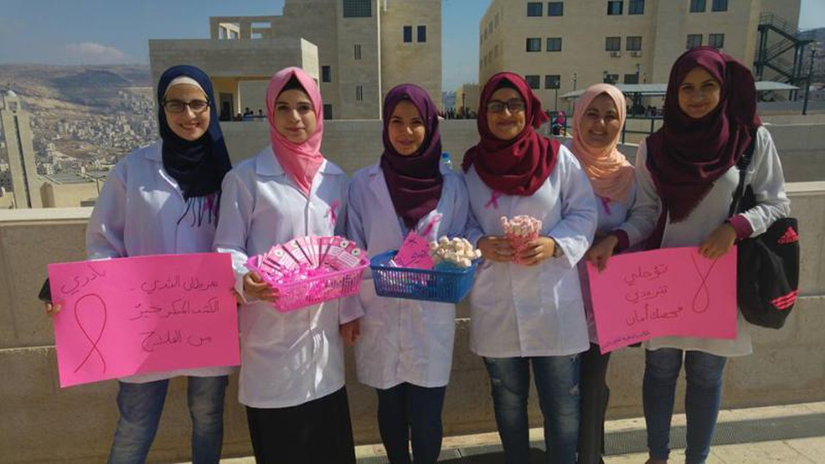 وقامت مجموعة من الطالبات يوم الأربعاء الموافق 26/10/2016، بتوزيع المنشورات والحلوى على المواطنين في دوار الشهداء والمجمع التجاري في مدينة نابلس، وتم زيارة محافظ محافظة نابلس اللواء أكرم الرجوب وإعطاءه نبذة عن الفعالية وعن سرطان الثدي، حيث قدّم اللواء الرجوب دعمه وتعاونه لهذه الحملة، مشدداً على أهمية الأنشطة المجتمعية.