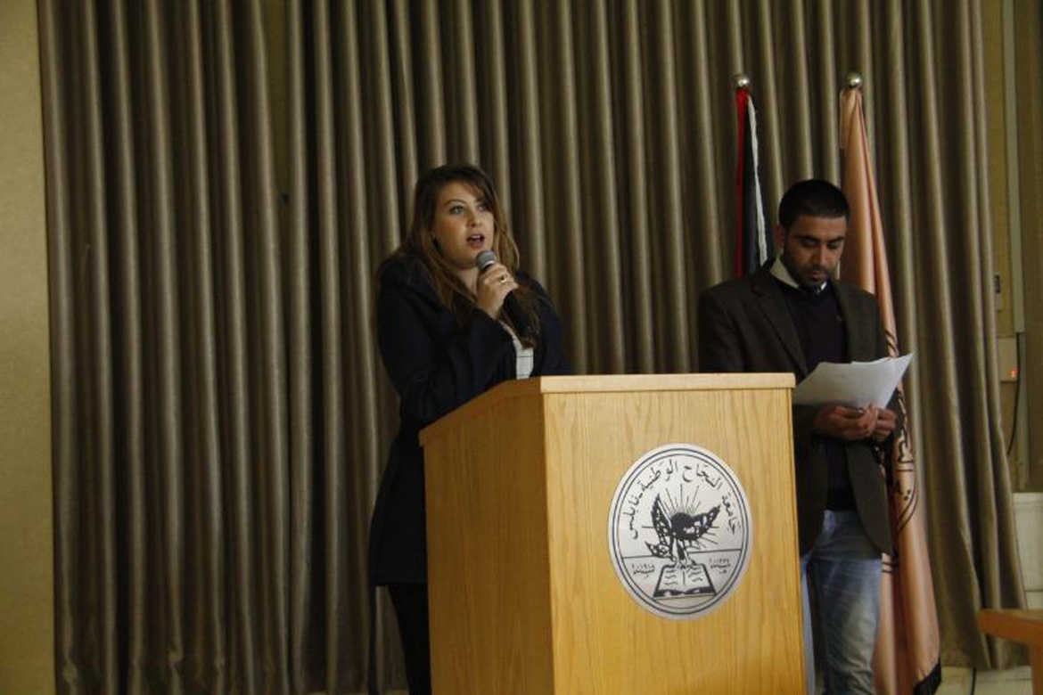 في حين تولى عرافة الحفل الأستاذ محمد مرشد، منسق الأنشطة في دائرة العلاقات العامة في جامعة النجاح، والآنسة عليا جلبرت، منسقة الزاوية الامريكية نابلس.