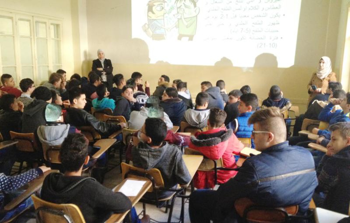 ألقت الدكتورة رشا خياط، المحاضرة في كلية الطب وعلوم الصحة في الجامعة، يوم الإثنين، الموافق: 2016.12.12م، محاضرة علمية حول مرض جدري الماء (Chickenpox)، أمام طلبة صفوف التاسع والعاشر في مدرسة كلية الروضة للعلوم المهنية في مدينة نابلس.