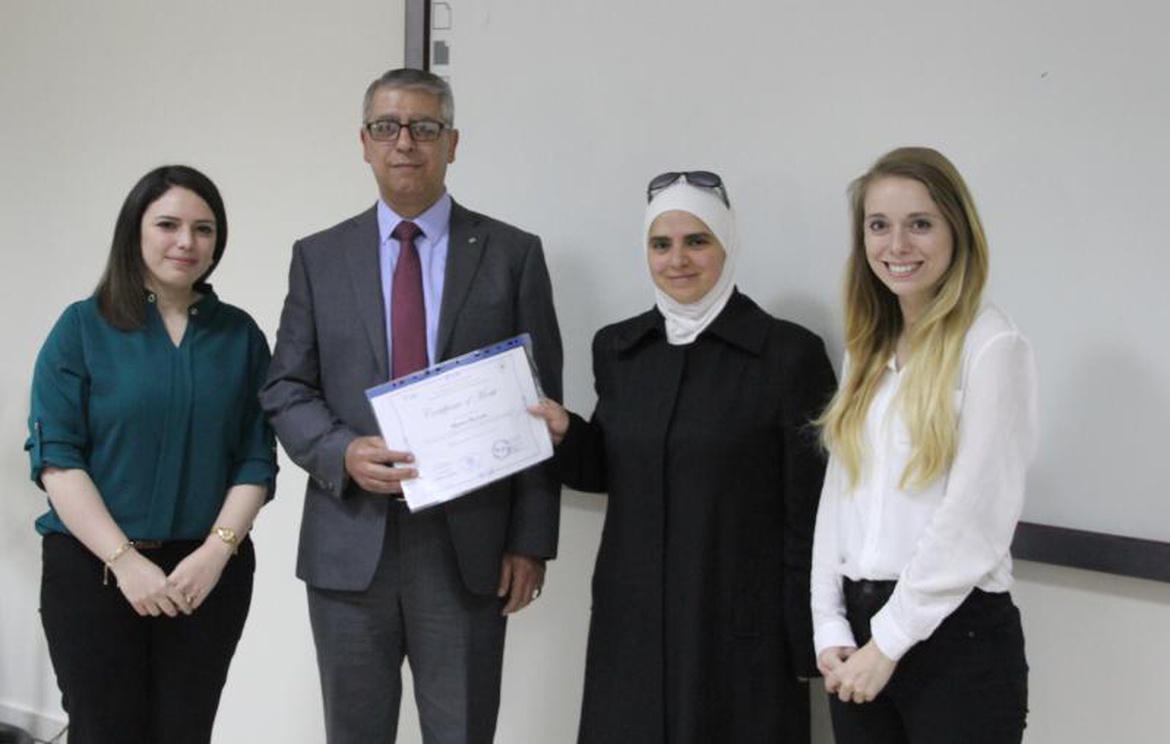 وحضر حفل التكريم الدكتور صبري ناصر، نائب رئيس الجامعة للشؤون الإدارية، والأستاذة لهى سماعنة، مديرة مركز الموارد التعليمية للغات، والأستاذة كريستين فانوف، مدربة الدورة من دائرة العلاقات الدولية في الجامعة، إضافة إلى العاملين المشاركين في الدورة من مختلف كليات الجامعة ودوائرها.