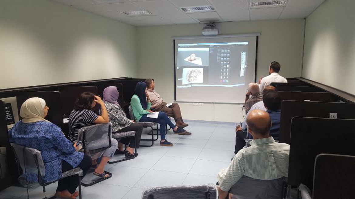 وقام المدرب خلفه بتقديم عرض حول مفهوم الواقع المعزز والفرق بينه وبين الواقع الافتراضي ومن ثم قام بعرض فيديوهات على المتدربين تشرح فكرة الواقع المعزز وكيفية استخدامه في عدد من المجالات التعليمية والتجارب العملية ومن ثم تم العمل على إجراء تجربة عملية على موضوع الواقع المعزز حيث تم تثبيت تطبيق معد مسبقاً من قبل المدرب على الأجهزة الذكية لدى المتدربين لكي يقوموا باختبار التجربة بأنفسهم والاستمتاع بها.