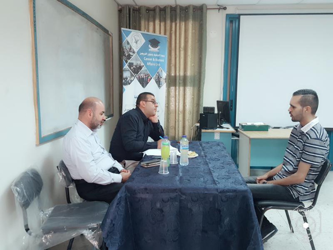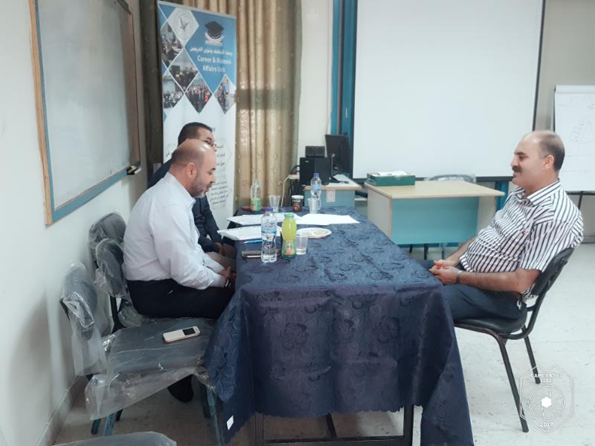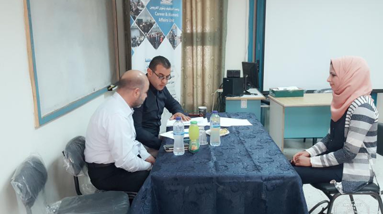وقبل إجراء المقابلات التقى الأستاذ رافع دراغمة مدير وحدة التوظيف مع كل من السيد شرباتي والسيد الزعتري وشكرهم على اهتمامهم بخريجي جامعة النجاح واتاحة الفرصة أمامهم لاجراء مقابلات عمل، حيث أن الزعتري قام بزيارة وحدة التوظيف سابقاً من أجل الترتيب والتنسيق لاجراء المقابلات.