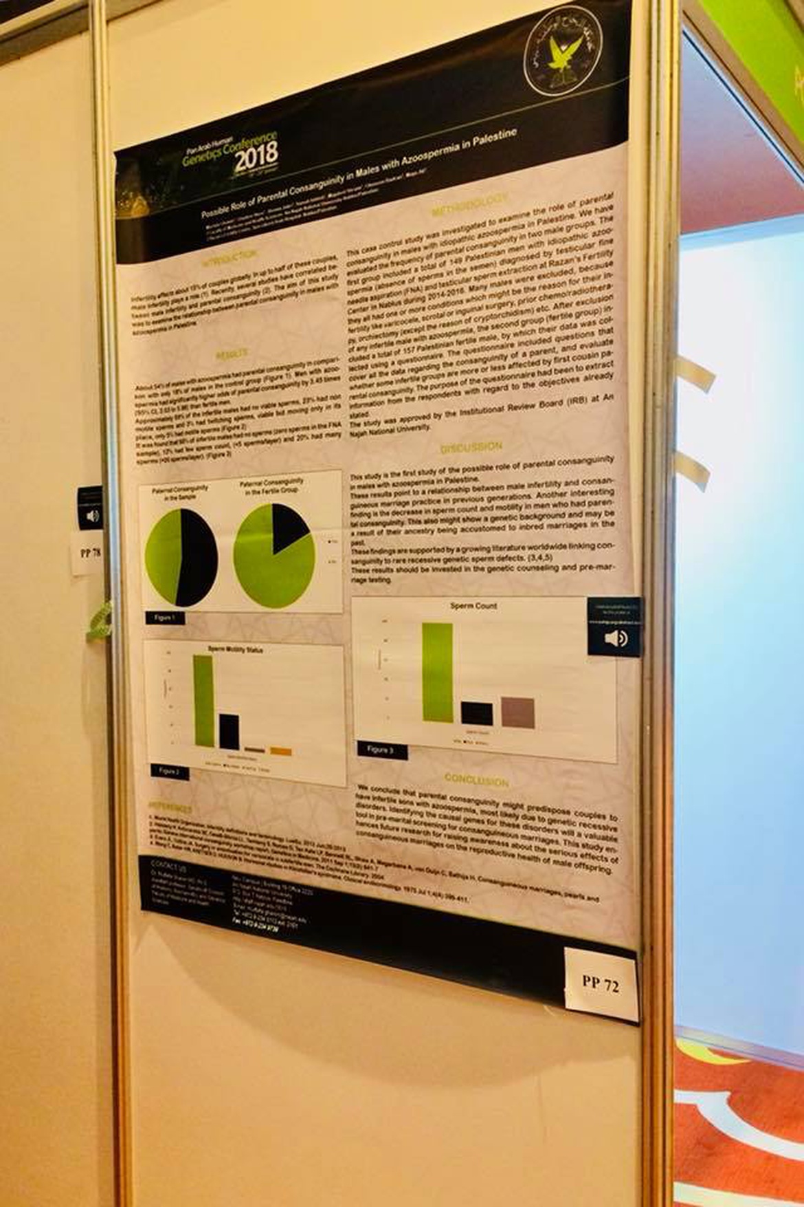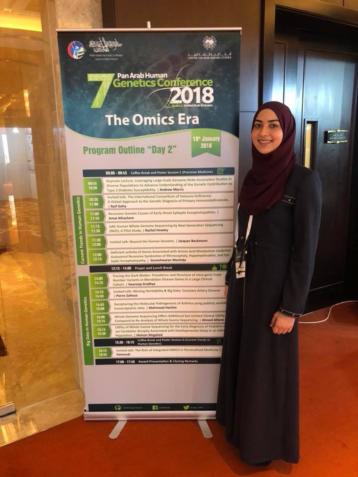 قدّمت الطالبة غدير الهوس، سنة سادسة في دائرة الطب البشري في كلية الطب وعلوم الصحة في جامعة النجاح، نتائج مشروع التخرج الذي يجمعها مع زميلتيها الطالبتين في الكلية ديمة جبر وميس علي في المؤتمر الدولي السابع لعلم الوراثة الإنساني والذي عُقد في دبي في الفترة ما بين 18-20/1/2018.