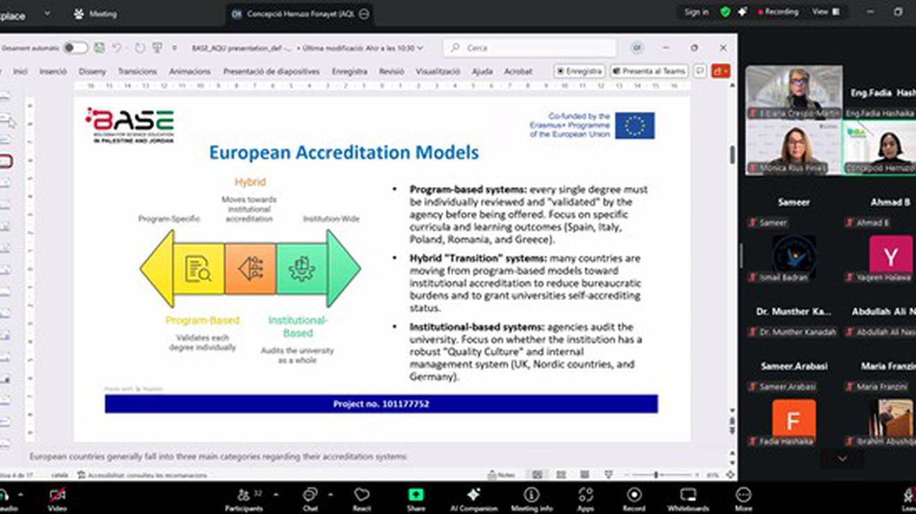 ويُذكر أن جامعة النجاح الوطنية قد أطلقت رسميًا مشروع BASE Erasmus+ في شباط 2025، بهدف تطوير كليات العلوم في الجامعات الفلسطينية والأردنية ومواءمة برامج البكالوريوس مع معايير عملية بولونيا الأوروبية. ويُنفذ المشروع من خلال شراكة دولية واسعة تقودها جامعة النجاح الوطنية بصفتها المنسق العام للمشروع، وتضم وزارتي التعليم العالي في فلسطين والأردن، وهيئات الاعتماد وضمان الجودة في البلدين، إلى جانب عدد من الجامعات الفلسطينية والأردنية، من بينها الجامعة العربية الأمريكية، وجامعة فلسطين التقنية خضوري، وجامعة العلوم والتكنولوجيا الأردنية، وجامعة البلقاء التطبيقية، والجامعة الألمانية الأردنية. كما يشارك في المشروع شركاء أوروبيون بارزون، من ضمنهم جامعة برشلونة ومؤسسة التضامن التابعة لها، وجامعة بيزا، واتحاد جامعات البحر الأبيض المتوسط (UNIMED)، إضافة إلى جمعية CIMEA الإيطالية المتخصصة في الاعتراف الأكاديمي والمؤهلات. إضافة إلى اتحاد الجامعات العربية ومؤسسة سكاي اديو للاستشارات التعليمية في فلسطين. وتجسد هذه الشراكة الواسعة تكاملًا فريدًا بين الخبرات الأوروبية والاحتياجات الوطنية في فلسطين والأردن، وتشكل ركيزة أساسية لتحقيق أهداف المشروع في إصلاح وتحديث برامج العلوم وضمان جودتها وفق المعايير الدولية.
