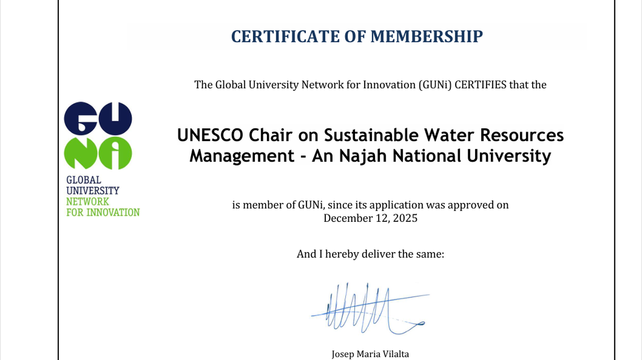 كرسي اليونسكو في الإدارة المستدامة للموارد المائية في جامعة النجاح الوطنية ينضم كعضو دائم في الشبكة العالمية للابتكار الجامعي (GUNi)