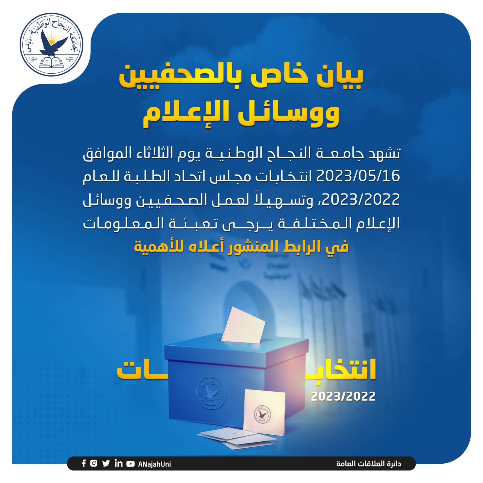تسهيلاً لعمل الصحفيين ووسائل الإعلام المختلفة يرجى تعبئة المعلومات للأهمية على الرابط التالي: https://www.najah.edu/ar/media2023