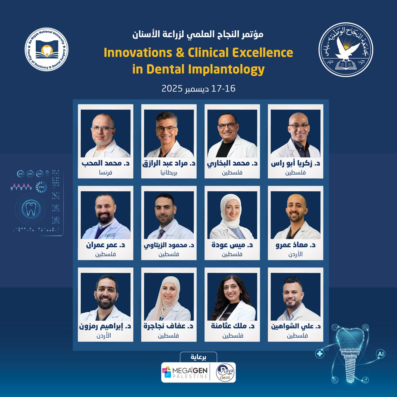 تواصل كلية طب وجراحة الفم والأسنان في جامعة النجاح الوطنية ترسيخ مكانتها كمنصة علمية رائدة من خلال تنظيم مؤتمر النجاح لزراعة الأسنان، الذي يشكّل حدثًا سنويًا بارزًا يجمع نخبة من الأطباء والمتخصصين والخبراء في زراعة الأسنان من مختلف المؤسسات المحلية والدولية.
