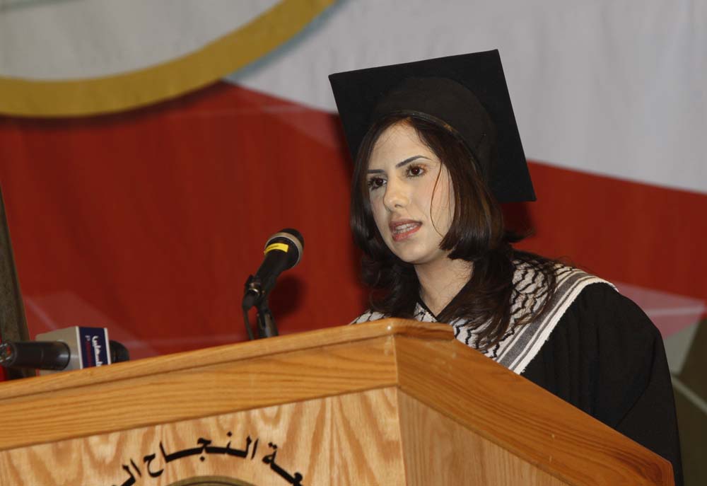 كما القت معالي وزيرة التربية والتعليم العالي الأستاذة لميس العلمي كلمة بهذه المناسبة هنأت فيها الطلبة الخريجين، وقالت ان الجامعات والمعاهد الفلسطينية تمثل معالم التقدم والحضارة ووهي أصبحت بالمقابل تفصل بينهما وبين التخلف والتراجع وهي بوابة الولوج إلى العلم والبحث العلمي والسعي الدؤوب لتحقيق مزيد من التطور والتقدم، وأضافت أن التعليم العالي شهد تطورا ملحوظا في السنوات القليلة الماضية واختلفت أنواع التعليم من خاص الى عام الى موازي وتعددت كذلك التخصصات في الجامعات تلبية لحاجات السوق المحلي والعربي والدولي، واضافت العلمي ان جامعة النجاح الوطنية لها سمعتها وحققت نجاحات على كافة الاصعدة.