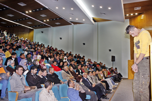 وقبل أداء العرض ألقى الأستاذ موسى أبو دية، عميد شؤون الطلبة، كلمة رحب فيها بالضيوف، ناقلاً لهم تحيات الأستاذ الدكتور رامي حمد الله رئيس الجامعة، الذي ما فتىء يوماً في دعم الأنشطة اللامنهجية، والوقوف على احتياجات الطلبة، مؤكداً في الوقت نفسه على أهمية الدراما كفن هادف من خلاله نستطيع أن نعبر عن أفكارنا ونحقق أهدافنا من خلاله.