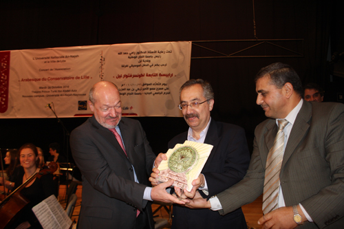 اما قنصل فرنسا العام السيد دزاينو فقد رحب بجميع الحضور وقال ان التوأمة بين ليل والجامعة عمرها اثني عشر عاما في مجال تكنولوجيا المعلومات، واضاف اننا هنا اليوم لنعزز هذا التعاون الثنائي من خلال فرقة ارابيسك التي لها دور في خلق تعاون بين البشر. واشار القنصل العام الى ان الشراكة بين الانسان الفلسطيني وفرنسا تتطور باستمرار وهذا دليل على عمق العلاقة القائمة، كما اكد السيد دزانيو التزام بلاده بتقديم الدعم للسلطة الوطنية الفلسطينية والشعب الفلسطيني ورغبة فرنسا بالمساهمة في اقامة الدولة الفلسطينية وبناء مؤسساتها وتطوير الشباب الفلسطيني.