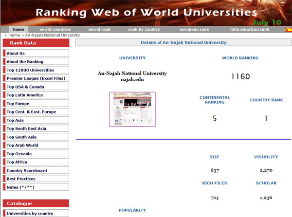 جامعة النجاح الوطنية الاولى على جامعات فلسطين والخامسة على جامعات الوطن العربي و1160 على مستوى العالم حسب التقييم العالمي للجامعات webometrics