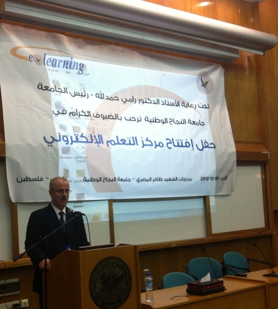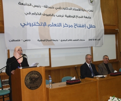 احتفلت جامعة النجاح الوطنية يوم الأحد الموافق 9/12/2012 بافتتاح مركز التعلم الإلكتروني في الجامعة، وحضر الأستاذ الدكتور رامي حمد الله، رئيس الجامعة الحفل الذي أقيم في مدرج الشهيد ظافر المصري في الحرم الجامعي القديم، كما حضر الحفل الأستاذ الدكتور ماهر النتشة، نائب رئيس الجامعة للشؤون الأكاديمية، والدكتور سائد الكوني، نائب رئيس الجامعة للشؤون الإدارية، والدكتورة سائدة عفونة، مديرة المركز، وعدد من عمداء الكليات، ورؤساء الأقسام، ومدراء الدوائر في الجامعة وطلبة من الجامعة.