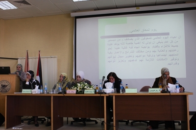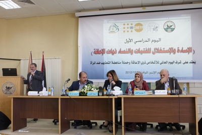 وشارك في افتتاح اليوم الدراسي أ. سامر عبده عقروق، مدير مكتب رعاية أصحاب الحاجات الخاصة، ممثلاً لرئيس الجامعة، وألقى كلمة الدكتور رئيس الجامعة الذي أشار فيها إلى أهمية التنبه والاهتمام بالنساء ذوات الإعاقة، وضرورة الاهتمام بهم من حيث التعليم والعمل والرعاية الصحية، وأشار إلى وجود 30 طالبة من ذوات الإعاقة في الجامعة وذلك ضمن 68 طالبا من ذوي الإعاقة الدارسين في الجامعة، وأكد أن الجامعة تقوم بدورها نحو ذوي الإعاقة من باب مسؤوليتها الاجتماعية، لذلك أنشأت مركزا للحاسوب لذوي الإعاقة البصرية، وأنشأت صندوقا خاصا للمنح الدراسية للطلبة ذوي الإعاقة أو ممن أولياء أمورهم من ذوي الإعاقة، وتقوم الجامعة من خلال التعاون مع التربية والتعليم وعدد من المؤسسات بحملات التوعية الخاصة بحقوق الأشخاص ذوي الإعاقة كما هي واردة في القوانين.