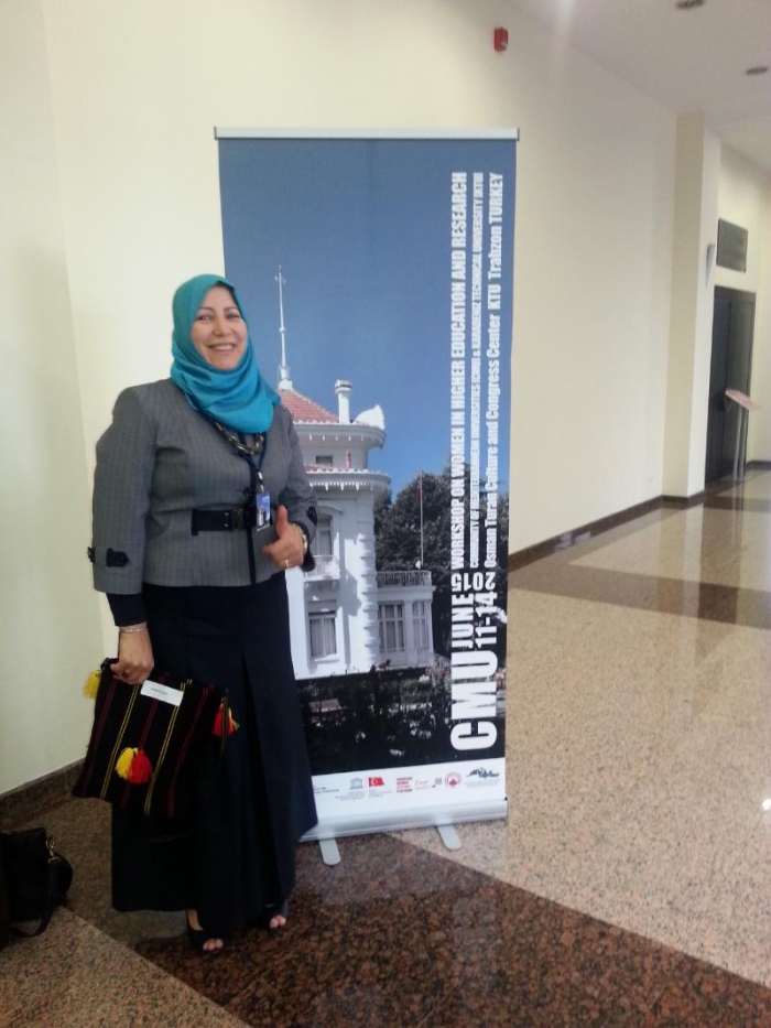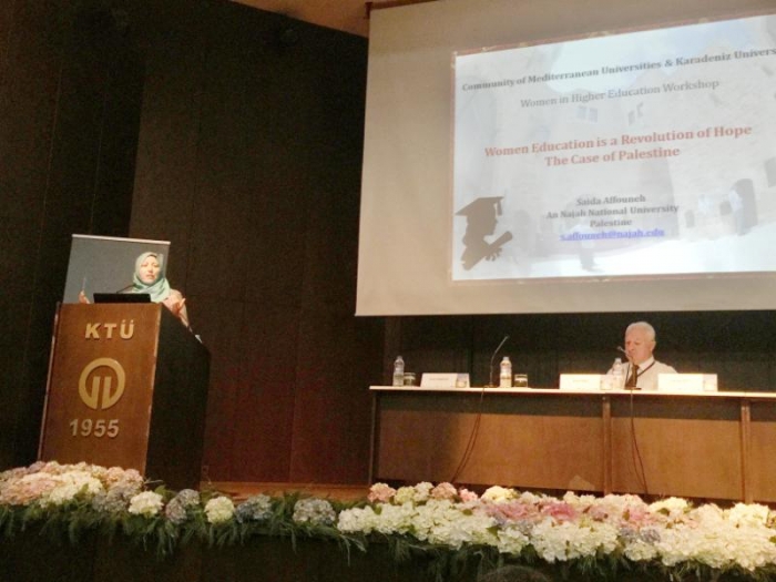 شاركت د. سائدة عفونة، مديرة مركز التعلم الالكتروني في الجامعة بورشة عمل حول المرأة في التعليم العالي والإجتماع السنوي لاتحاد جامعات حوض البحر الأبيض المتوسط في ترابزون بتركيا، وقدمت من خلال عرض تقديمي حالة فلسطين بعنوان "تعليم المرأة في فلسطين ثورة أمل " وقد عرضت في ورقتها أرقام وإحصائيات عن واقع المرأة في مؤسسات التعليم العالي ونسبة الإناث في مؤسسات التعليم العالي وتوزيعها على التخصصات التي بلغت 60% من الملتحقين بالتعليم العالي، إلا أن نسبة العاملات من حملة الماجستير والدكتوراه لم تتجاوز 20%.