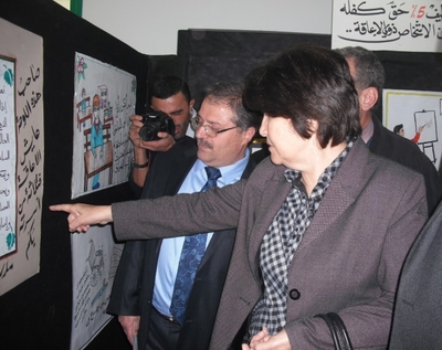 وتحدثت بعد ذلك وزيرة الشؤون الاجتماعية عن ما تقوم به الوزارة من خدمات مباشرة أو من خلال استئجار خدمات من مؤسسات أخرى وذلك لتلبية احتياجات ذوي الإعاقة، وأضافت أن الوزارة تعمل على الإعلان عن الخطة الإستراتيجية لذوي الإعاقة والتي تتضمن التركيز على التأهيل وإعادة التأهيل والتركيز على الدمج المجتمعي لذوي الإعاقة من خلال العمل والترفيه والرعاية الطبية وغيرها، كما إشارة إلى قرب إصدار بطاقة المعوق والتي ستضمن الكثير من الحقوق المنصوص عليها في قانون المعاقين، وأشارت إلى إمكانية تخصيص مزيد من الموارد المالية لدعم مشاريع ذوي الإعاقة، وأبدت إعجابها بمعرض الصور وبالمهرجان والفعاليات التي تؤكد إبداع وتحدي ذوي الإعاقة.