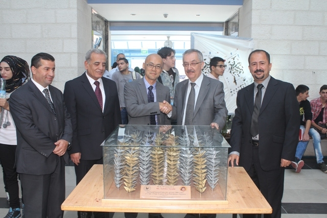 وقام الضيوف برفقة أ. د. ماهر النتشه، القائم بأعمال رئيس الجامعة، بعمل جولة في معرض الصور الفوتوغرافية، حيث سروا بما وقعت عليه أعينهم من مناظر جمالية وطبيعة تعكس البيئة في فلسطين، وقام أ. د. النتشه، بتقديم لوحة تحوي ألف طائر غرنوق، قام د. وليد باشا، بإعدادها وثلاث طالبات من كلية الطب وعلوم الصحة في الجامعة، لتقدّم إلى الحكومة اليابانية باسم كلية الطب وعلوم الصحة-جامعة النجاح الوطنية كرسالة سلام ومحبة من الشعب الفلسطيني إلى الشعب الياباني.