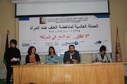 أما الأستاذة سعاد اشتيوي، منسقة منتدى المنظمات الأهلية الفلسطينية لمناهضة العنف ضد المرأة فقالت: إن هذا النشاط يأتي بمناسبة اليوم العالمي لمناهضة العنف ضد المرأة والذي يستمر حتى العاشر من كانون ثاني من كل عام، ويهدف إلى تسليط الضوء على قضية العنف ضد المرأة في المجتمع الفلسطيني كقضية اجتماعية، ومحاولة الضغط على صناع القرار لتعديل القوانين الخاصة بهذا الموضوع، وأضافت أنه سيتم عرض ملف حي من قضايا العنف ضد المرأة وتحديداً موضوع جرائم الشرف ضد النساء.
