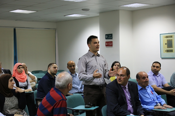 وبعد ذلك تركت الحديث للاستاذ الدكتور ماهر النتشة الذي رحب بالمبتعثين العائدين وعبرلهم عن مدى فرحته برؤيتهم وانضمامهم لاسرة الجامعة وشكرهم على رفع اسم جامعة النجاح في الجامعات التي درسوا فيها كما وحثهم على عدم التوقف هنا بل السعي دائما للحصول على الدرجات الاعلى وطلب منهم الاطلاع على قوانين الجامعة لتجنب حدوث اي لبس وفي نهاية كلمته طلب منهم التعريف بانفسهم وتخصصاتهم والجامعات التي درسوا بها.