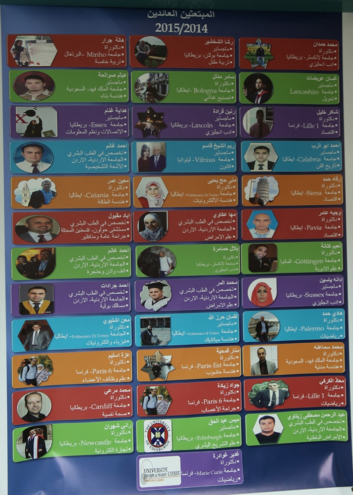 في بداية الحفل رحبت د. رشا باسم مكتب ولجنة البعثات بالحضور وكذلك بالمبتعثين العائدين خلال العامين 2014/2015وعددهم 37 مبتعث ابتعثوا للحصول على درجة الدكتوراة او الماجستير او التخصص في الطب البشري سواء حصلوا عليها بجهد شخصي او من خلال مكتب البعثات وجميعهم التزموا بالعودة للتدريس في جامعتهم الام جامعة النجاح الوطنية، وعبرت عن فخرها وسعادتها بهم وبعودتهم موضحة ان دور مكتب البعثات قد بدأ معهم منذ بداية الابتعاث وتجهيز ما يلزم لذلك ومن ثم متابعة كل امورهم خلال ابتعاثهم انتهاء بعودتهم لكلياتهم واقسامهم موضحة ان دورهم بدأ الان لنقل تجربتهم لطلابهم وتشجيعهم على التقديم للبعثات المختلفة.