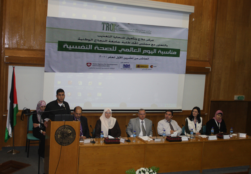 عقد مركز علاج وتأهيل ضحايا التعذيب بالتعاون مع مجلس الطلبة في الجامعة ورشة عمل بمناسبة اليوم العالمي للصحة النفسية، شارك فيها جامعة النجاح الوطنية ومركز علاج وتأهيل ضحايا التعذيب ومديرية صحة محافظة نابلس فيما حضر الورشة عدد من طلبة الجامعة والمدعوين وعقدت في مدرج الشهيد ظافر المصري في الحرم الجامعي القديم.