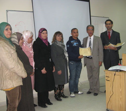 وفي نهاية الدورة قام د. المصري، مدير مركز التعليم المستمر ود. القيسي، عميدة كلية التمريض والمدربين في الدورة بتوزيع الشهادات على المشاركين في الدورة والذي بلغ عددهم اكثر من 40 مشارك ومشاركة من طلبة كلية التمريض وعدد من الممرضين العاملين في المستشفيات ألعامة والخاصة في الوطن.