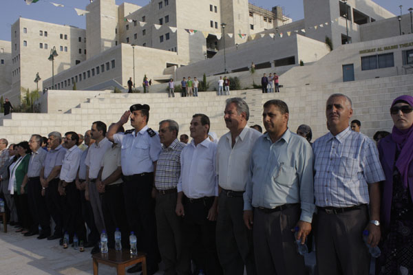 وبدا الحفل بتلاوة عطرة من الذكر الحكيم ثم عزفت جوقة الجامعة التابعة لكلية الفنون السلام الوطني الفلسطيني، بعد ذلك قام عريف الحفل الاستاذ موسى ابو ديه بالترحيب بالضيوف والحضور.