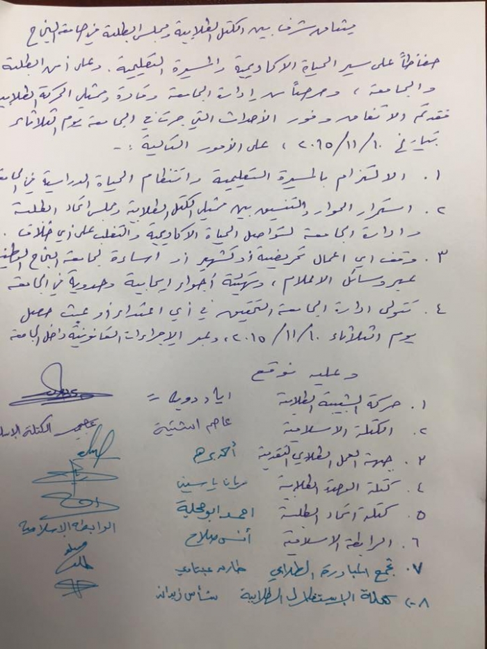 حفاظاً على سير الحياة الاكاديمية والمسيرة التعليمية وعلى امن الطلبة والجامعة، وحرصاً من ادارة الجامعة وقادة وممثلي الحركة الطلابية، تم الاتفاق وفور الاحداث التي جرت في الجامعة اليوم الثلاثاء الموافق 10/11/2015 على الإلتزام بالمسيرة التعليمية وانتظام الحياة الدراسية في الجامعة، واستمرار الحوار والتنسيق بين ممثلي الكتل الطلابية ومجلس اتحاد الطلبة وادارة الجامعة لتواصل الحياة الأكاديمية والتغلب على اي خلاف، ووقف اي اعمال تحريضيه او تشهير او اساءة لجامعة النجاح الوطنية عبر وسائل الاعلام، وتهيئة اجواء ايجابية وحدوية في الجامعة، وتتولى ادارة الجامعة التحقيق في اي اعتداء حصل يوم الثلاثاء الموافق 10/11/2015، وعبر الاجراءات القانونية داخل الجامعة.