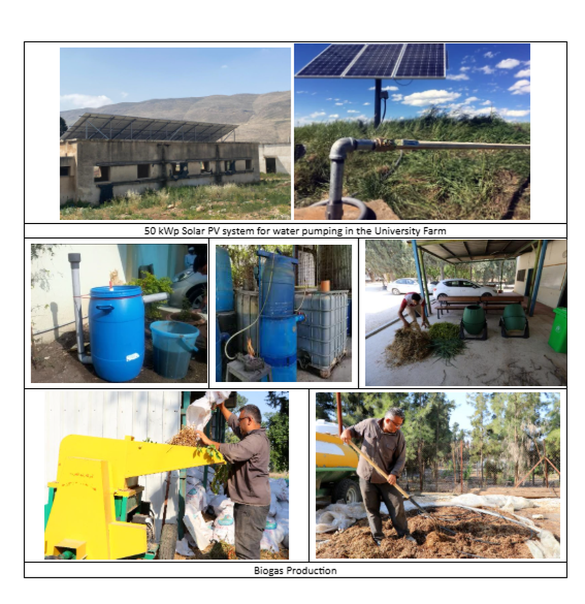 • Agricultural residues and pruning waste from university farms are used as biomass fuel for heating greenhouses and experimental labs.