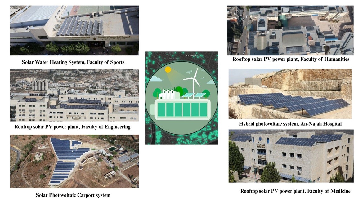Multiple rooftop solar photovoltaic (PV) systems with a total capacity of 1.5 MW (2,118,200 kWh/year) have been installed across faculties including Medicine, Engineering, Agriculture, Educational Sciences, Humanities, and at An-Najah University Hospital. -