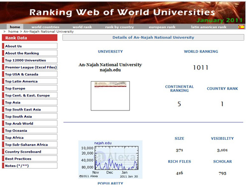 Wednesday, February 2nd. Once again, An-Najah National University was ranked top university in Palestine, fifth in the Arab world according to Webometrics (Ranking Web of World Universities); a rank it has maintained since the last ranking on July 19th 2010. The University also progressed on the international level as it was ranked number 1,011 amongst 20,000 Higher Education Institutions globally after being ranked number 1160 according to the last year ranking.