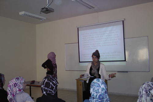 Shorouq Qadous delivered a lecture on insulin treatment during pregnancy and how the insulin dose changes depending on the period of the pregnancy. She also described the many types of insulin and how each types works, in addition to giving advice to pregnant women who have Diabetes to focus on self nourishment and weight control. Furthermore, she spoke about the risks that irregular sugar levels can inflict on the mother and her child.