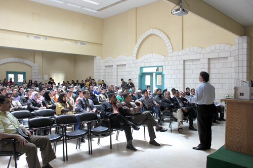 Dr. Khaled Hijjeh, Director of the Planning Department at Jawwal, said that the Company has most of its employees from the faculties of engineering and economics at the University. He also explained the different technologies that the Company uses and mentioned that the different branches of engineering must be integrated into one system in which communication and mechanical engineering, for example, coordinate efforts to achieve the desired development in Palestine.