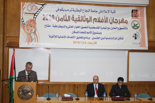 December 8th 2010. In cooperation with the Palestinian Initiative for the Promotion of Global Dialogue and Democracy (MIFTAH) and the United Nations Population Fund (UNFPA), the Faculty of Media at the University organized the 8th Documentary Film Festival for the year 2010. The Festival was organized as part of a UN project titled "Women's Empowerment and Gender Equality: Achievement of the Millennium Development Goals Program".