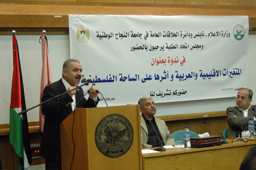 On March 31st, the Public Relations Department at An-Najah National University, in cooperation with the Students’ Union Council and the Ministry of Information-Nablus Office, organized a political seminar about the regional changes in the Arab world and their impact on the Palestinian cause. Attendees included: Prof. Maher Abu Eid, An-Najah Vice President for Academic Affairs, Dr. Muhammad Shtayyeh, member of the Central Committee in Fateh political party, Dr. Ahmed Tibi, member in the Knesset, in addition to a number of students and others.